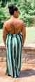 This style features a pleated bib at front, V-neckline, adjustable crossed straps at back, tie detail at front, and invisible zipper closure at center back.