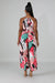 The "Summer Time" jumper features, a stretchy fabric, mock neckline, side pockets, elastic waist line, finished with a self tie back nape closure.